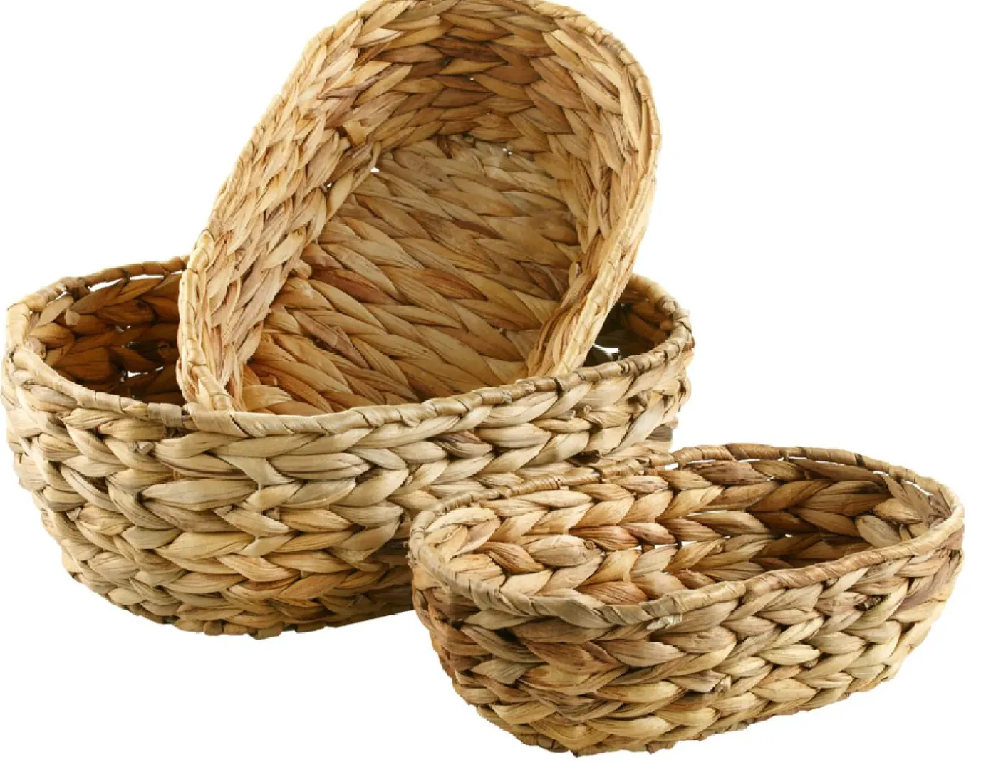 Ovale Körbe aus Wasserhyazinthe. Diese dekorativen Körbe sind ideal zum Befüllen mit kleinen Leckereien, Dekoartikeln oder Geschenken. Set bestehend aus drei Körben.