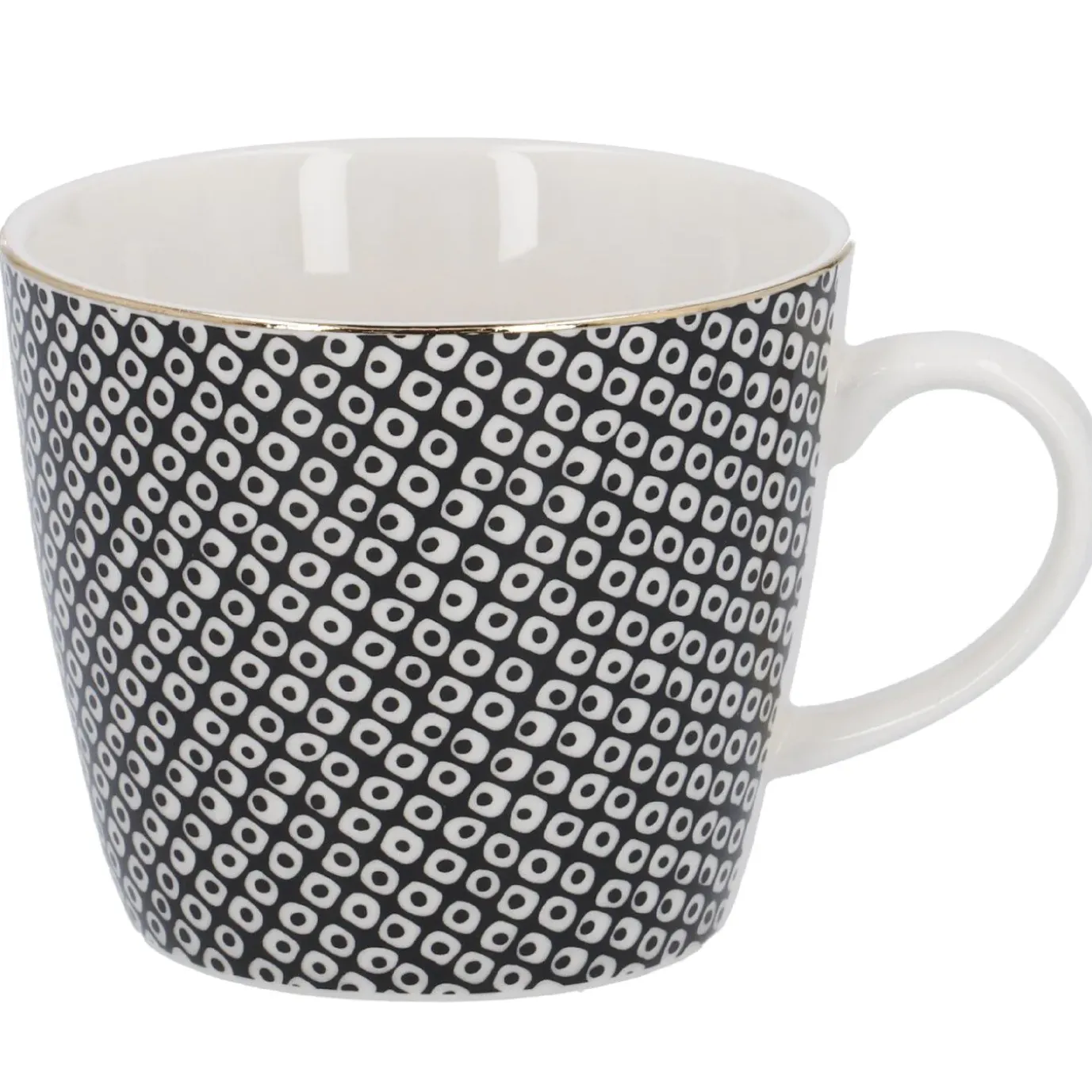 Schöner trinken: Genieße deinen Kaffee, Tee und Co. aus diesem schwarz-weiß gemusterten Porzellanbecher mit Goldrand. Schluck für Schluck ein Genuss.