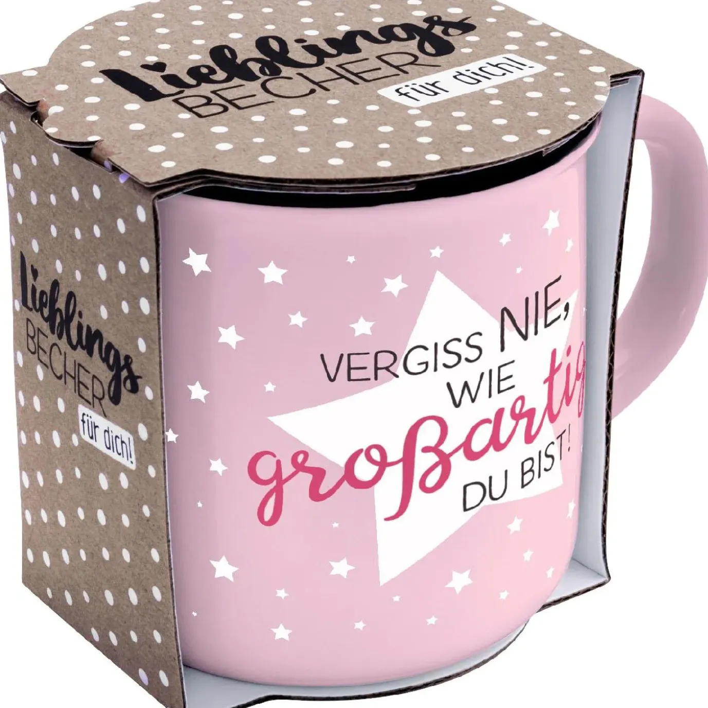 Großartige Menschen leuchten wie die hellsten Sterne am klaren Nachthimmel. Schenke Deinem Stern diesen wundervollen Becher in Emaille-Optik, damit er nie vergisst, wie großartig er ist. Dank der tollen Geschenkbanderole ist dieser rosafarbene Sternen-Becher startklar zum Verschenken.