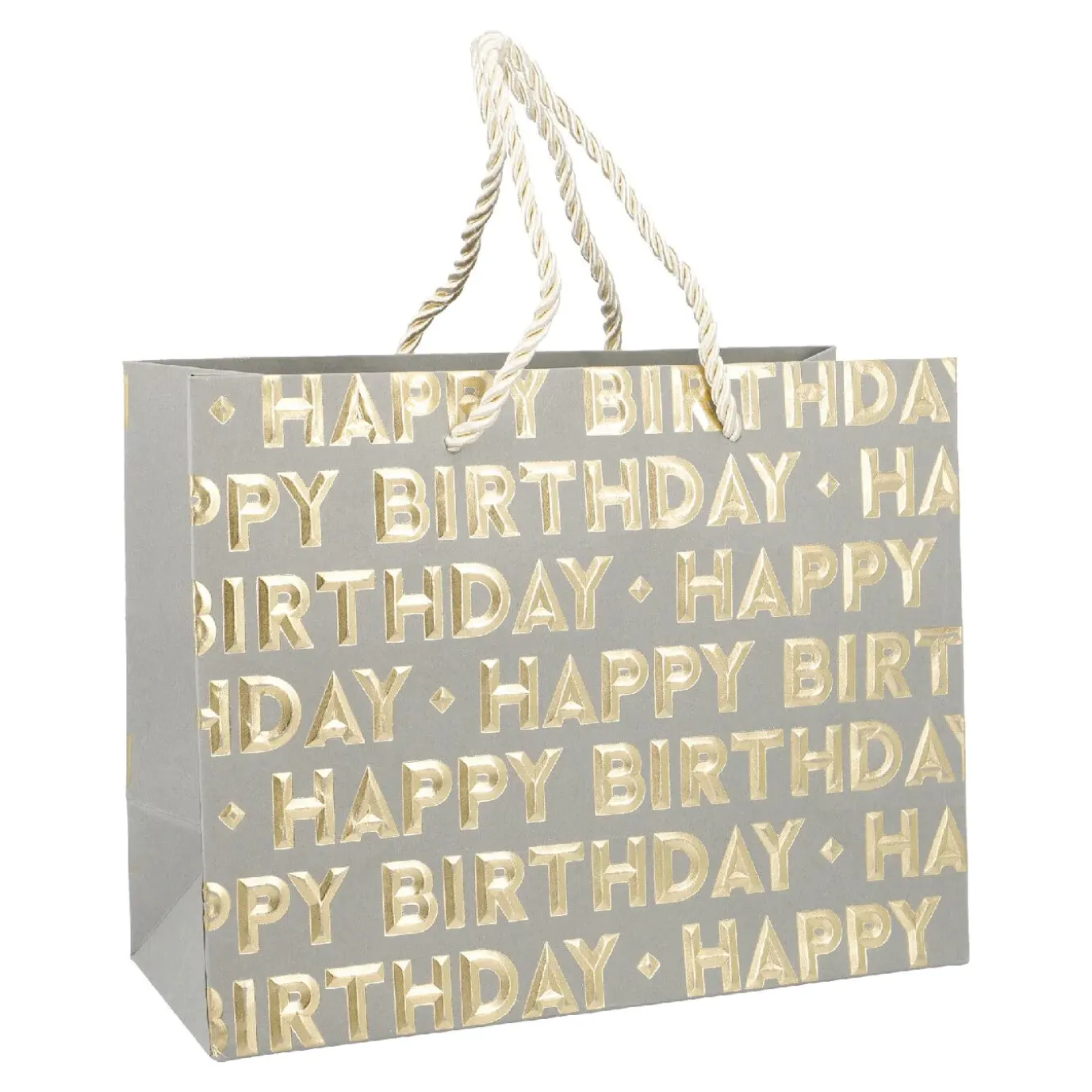 Die graue Geschenktüte mit der Aufschrift „Happy Birthday“ ist die ideale Lösung, um deine Geburtstagsgeschenke stilvoll zu verpacken.