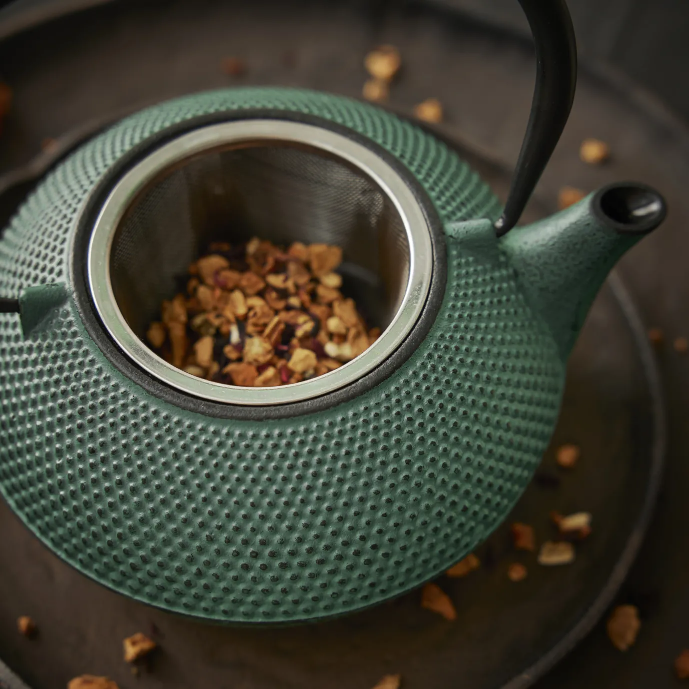 Zeitlos schöne Teekanne aus Gusseisen. Aus dieser schmucken Kanne schmeckt dein Tee gleich noch besser! Mit dem Edelstahlsieb wird der fertige Tee von den Teeresten getrennt und ist gleich trinkfertig. Für 0,8 Liter Teegenuss geeignet. Wichtige Pflegehinweise!Die Kanne ist aus Gusseisen und bedarf deshalb besonderer Pflege.1. Vor der ersten Benutzung die Teekanne 2-3x mit heißem Wasser ausspülen. Trocke die Kanne innen und außen mit einem weichen Tuch.2. Die Teekanne ist innen emailliert. Deshalb verwende bitte nur solche Küchenutensilien, mit denen die Emaille nicht verkratzt wird.3. Die gusseiserne Teekanne ist nicht geeignet für die Zubereitung von Früchtetee, Tee mit Zitrusfrüchten oder Zitrusaromen (z.B. Earl Grey, Früchtetee oder schwarzer Tee mit Orange).4. Keine Tee- oder Wasserreste in der Teekanne stehen lassen.5. Nach jeder Benutzung die Teekanne mit klarem Wasser ausspülen. Kein Geschirrspülmittel oder andere Reinigungsmittel verwenden. Die Teekanne immer sofort mit einem trockenen, weichen Tuch abtrocknen.6. Die noch warme Teekanne niemals abrupt abkühlen.7. Kontakt mit Salz und Öl vermeiden.8. Die Teekanne ist nicht mikrowellen- oder spülmaschinengeeignet.9. Die Teekanne nicht auf offener Flamme erhitzen.