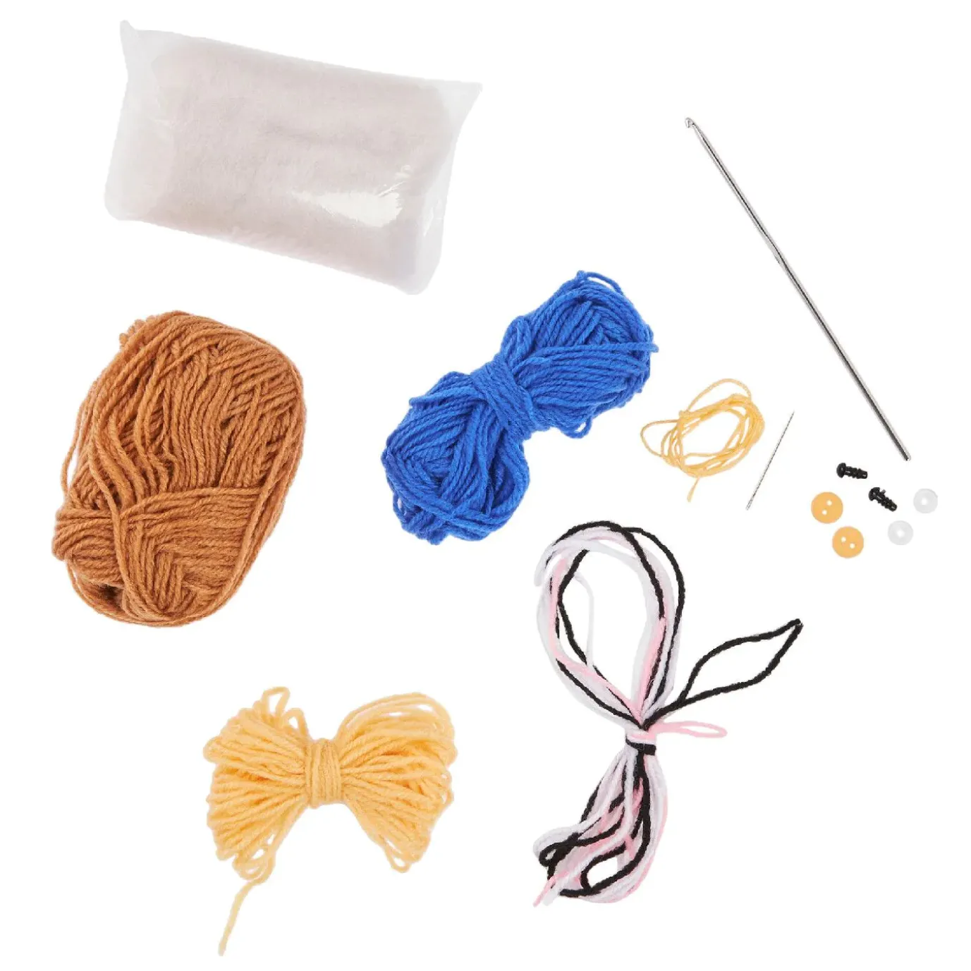 Häkel-Set: Häkelnadel 3 mm, Acrylgarn in verschiedenen Farben, Füllmaterial, Sicherheitsaugen und Anleitung.
