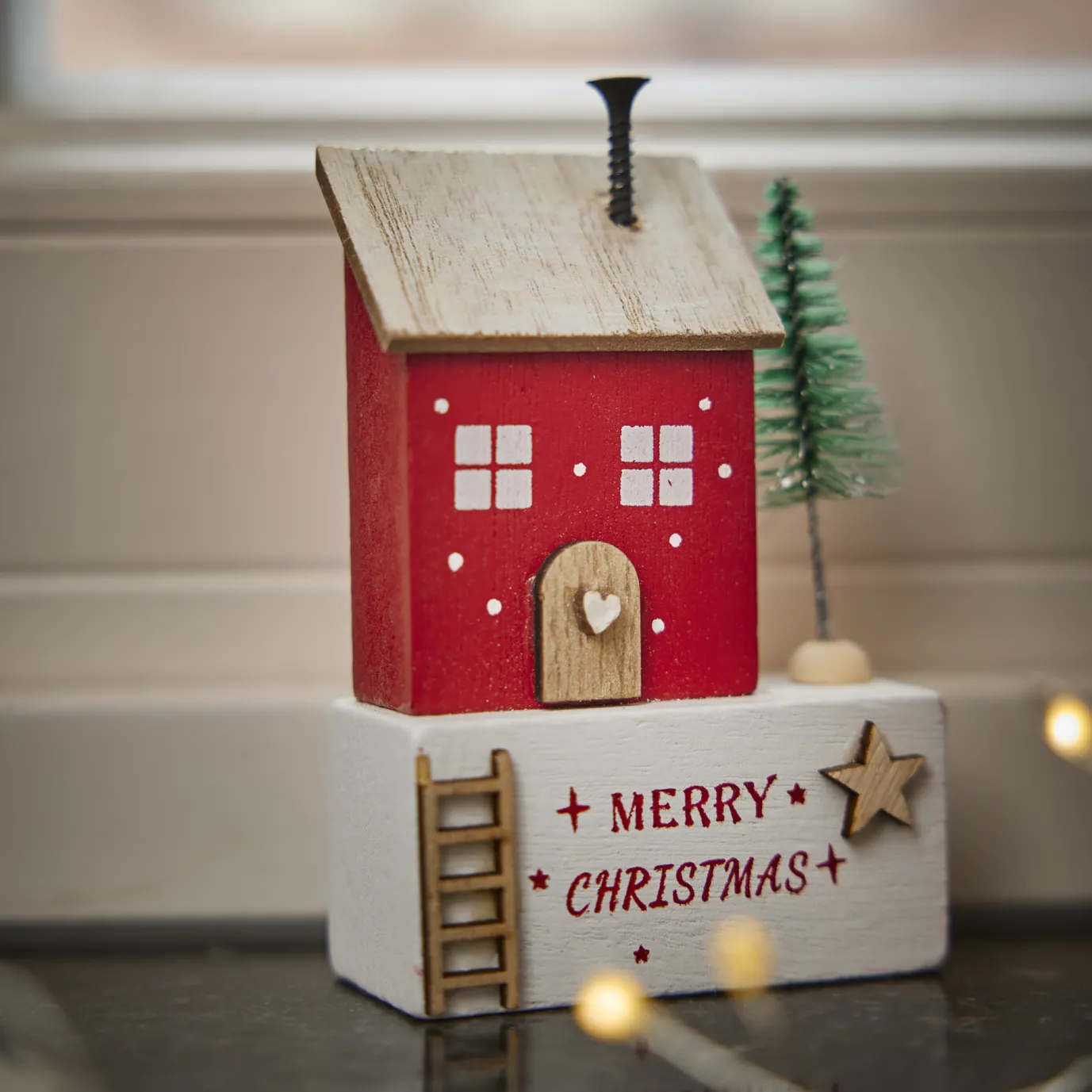 Für dein Weihnachtsdorf: Hübsches Dekohaus aus Holz für weihnachtlichen Spirit.