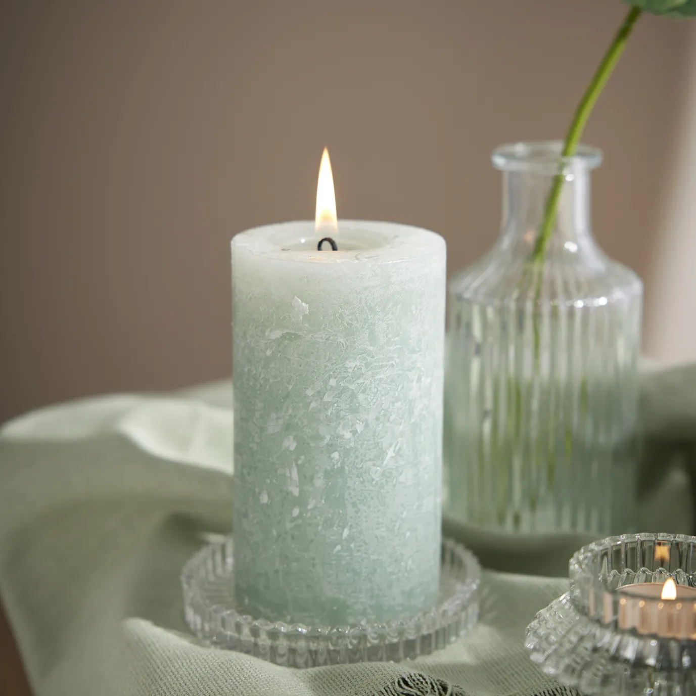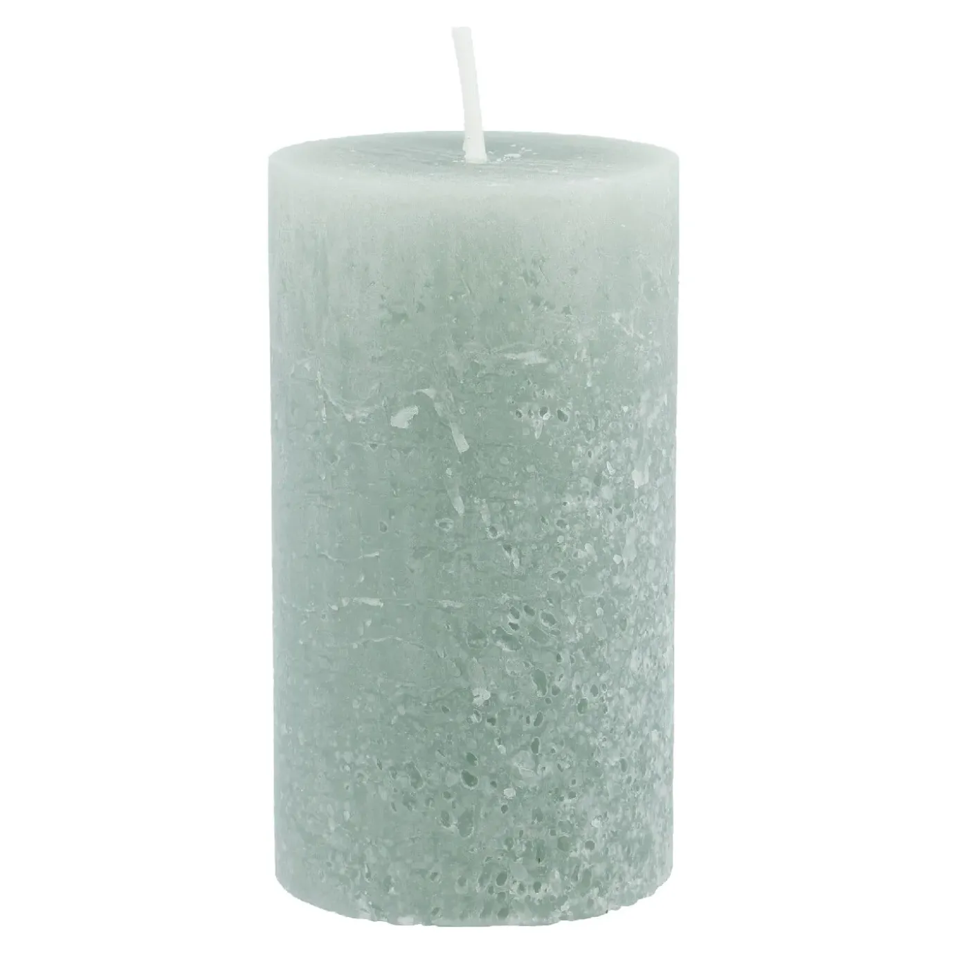Stimmungsvolles Kerzenlicht verbreitet diese salbeifarbene Stumpenkerze. Ideal für dein Zuhause, Hochzeiten oder Feiern.
