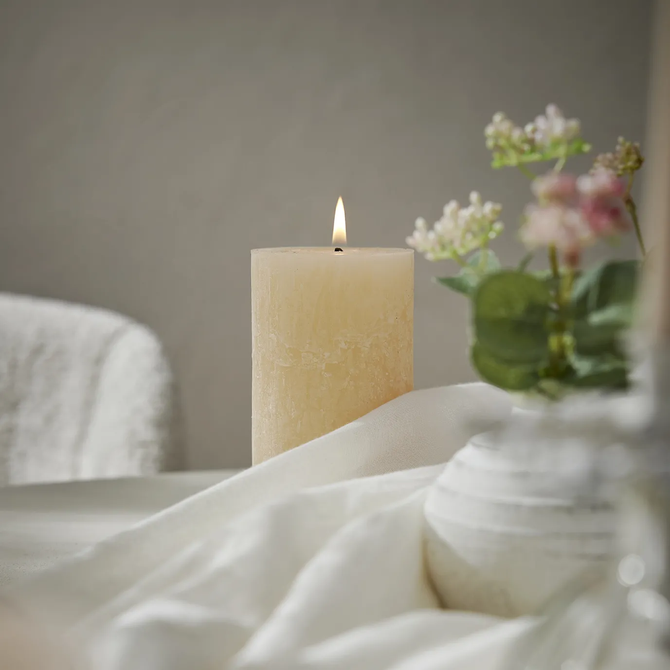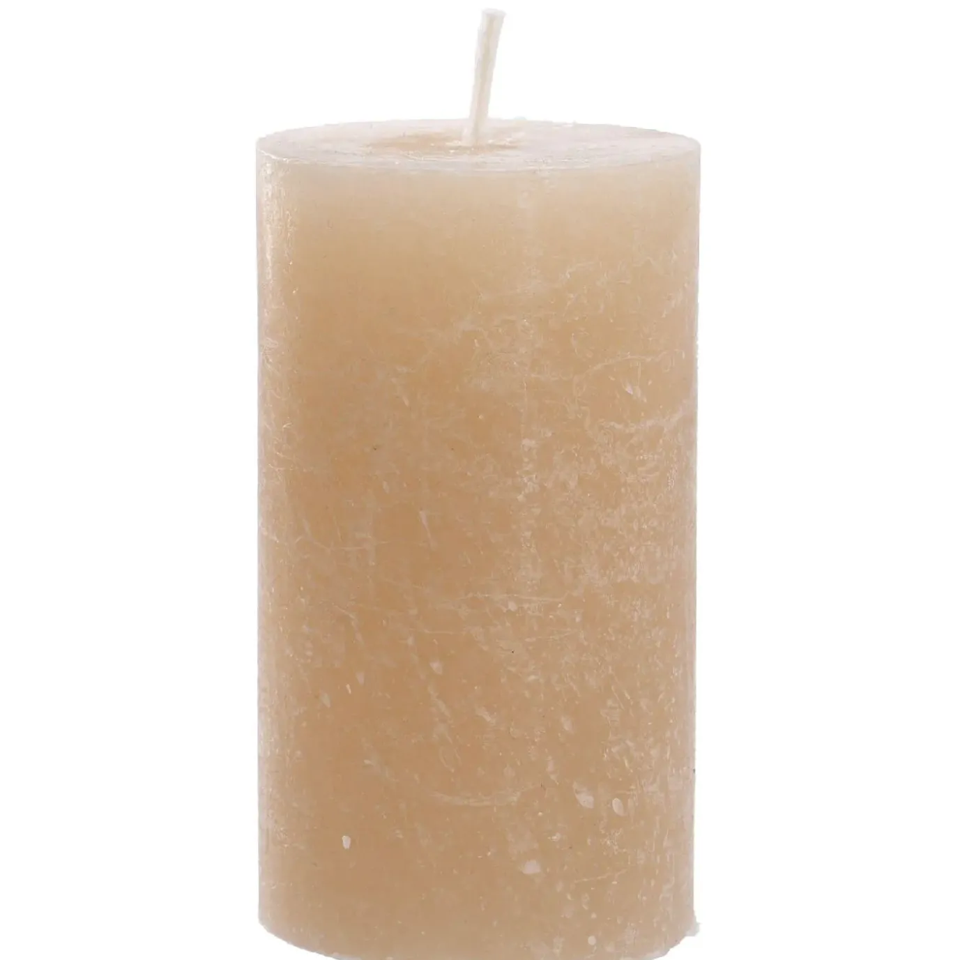 Stimmungsvolles Kerzenlicht verbreitet diese sandfarbene Stumpenkerze. Ideal für dein Zuhause, Hochzeiten oder Feiern.