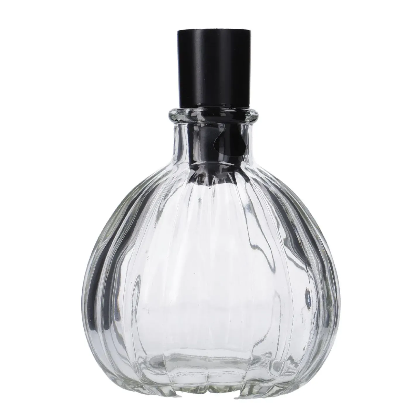 Schlichte Vase mit Rillen und einem schwarzen Aufsatz für eine Standard-Stabkerze. Der Kerzenhalter ist fest mit der Vase verklebt.