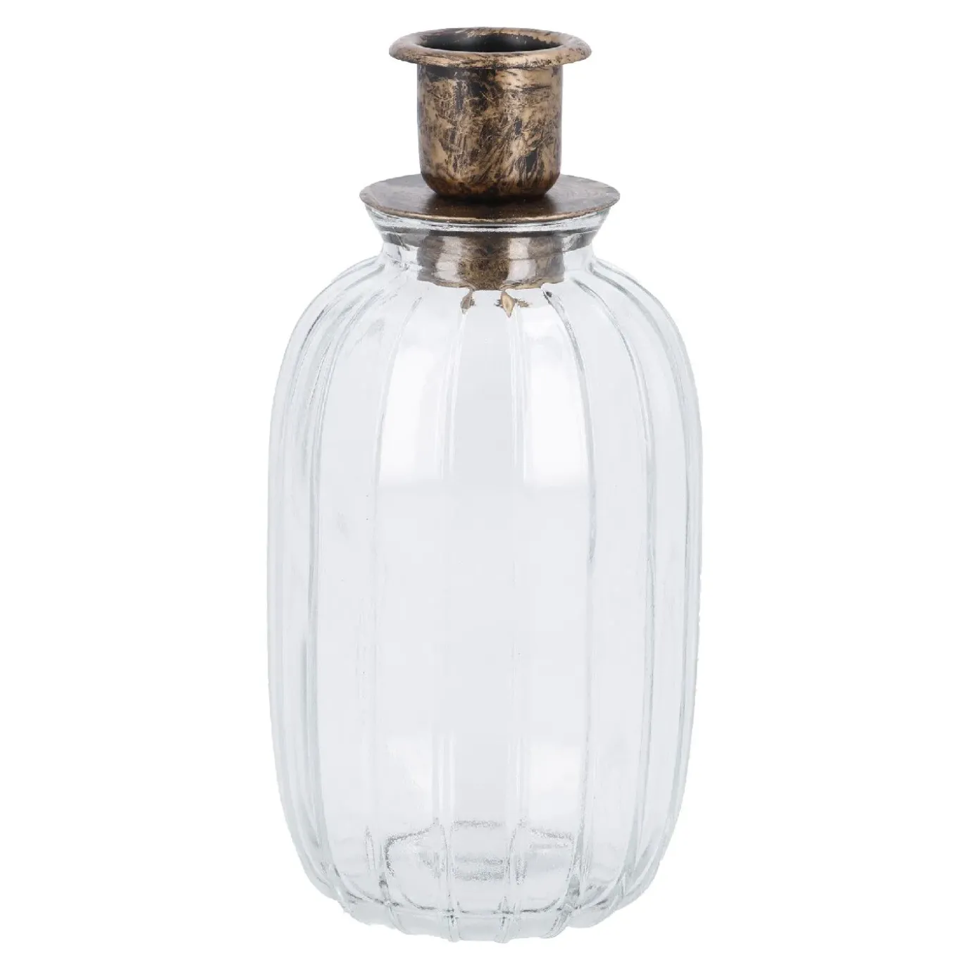 Platziere deine Stabkerze in diesem gerillten Glas mit Metall-Aufsatz. Der Kerzen-Aufsatz ist mit einem wunderschönen gold-antik Finish versehen.