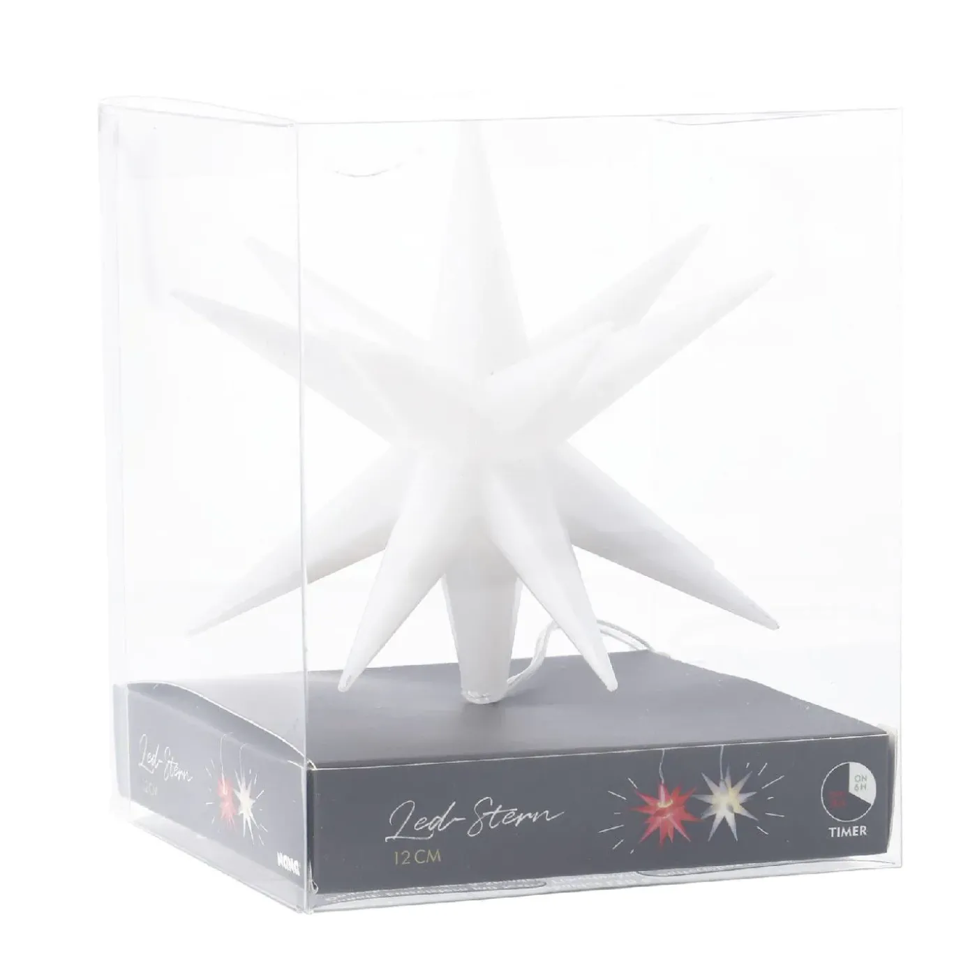 Einzelstern mit festverbauter LED & Batteriebox mit Timer, Dauerbetrieb oder 6-Stunden Timerfunktion per Schalter wählbar.