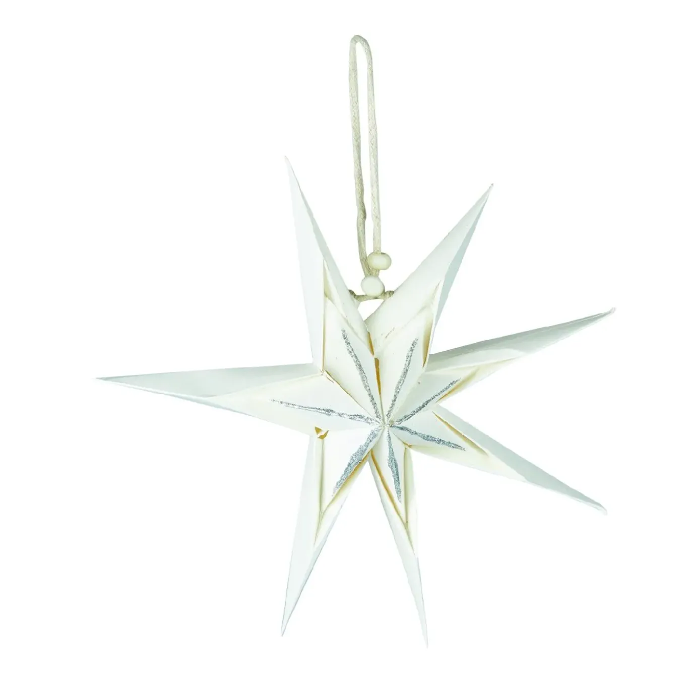 Bring dein Zuhause in Festtagsstimmung! Dieser wunderschöne weiße Papierstern mit silberner 3D Optik zaubert eine tolle weihnachtliche Atmosphäre. Mit einer Schnur kannst du ihn kinderleicht überall befestigen. Die Schnur ist 12 cm lang.