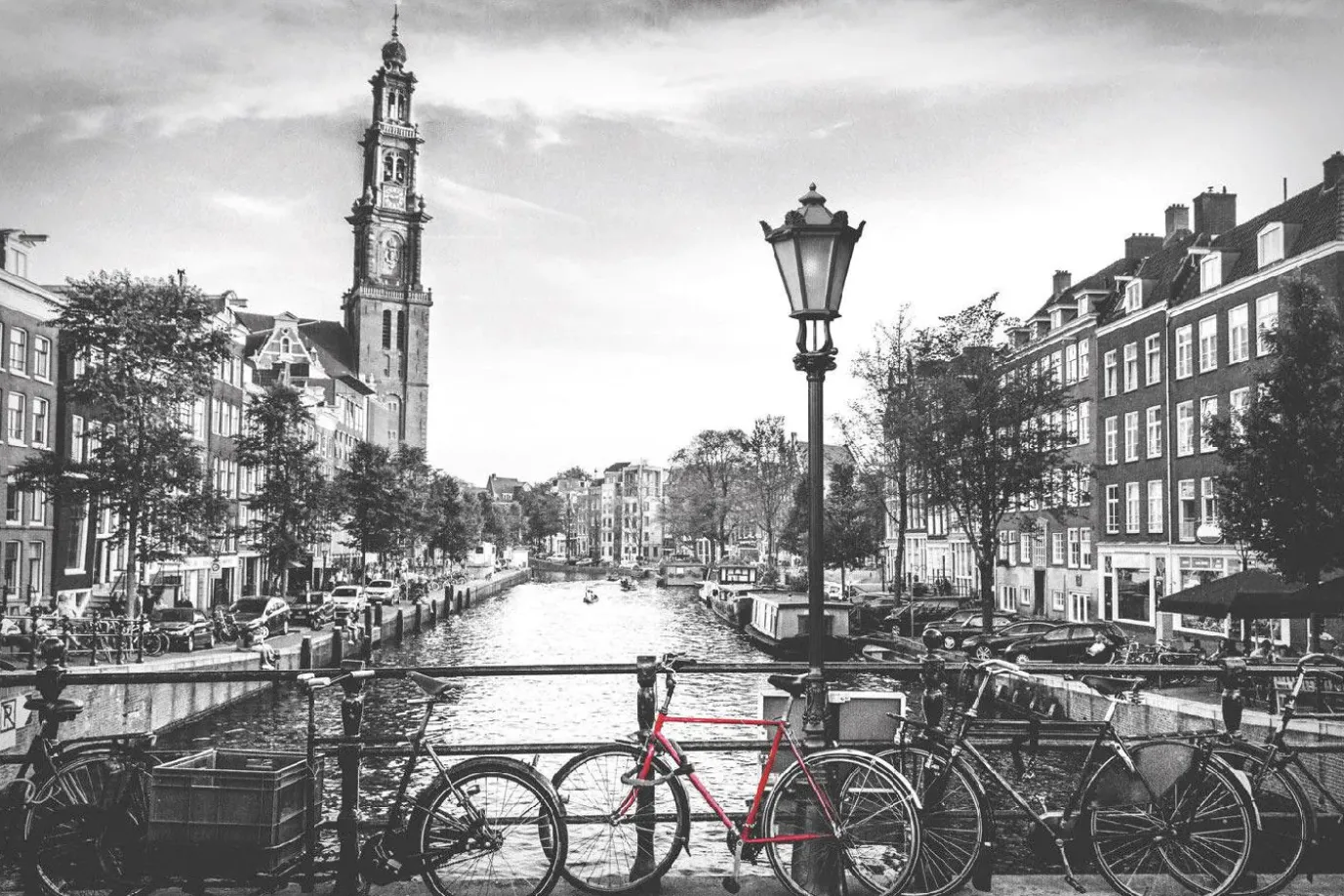 Wunderschöne Momentaufnahme von den Grachten von Amsterdam. Das schwarz-weiß Poster mit dem farbigen Fahrrad ist ein tolles Wandbild für alle Amsterdam Fans.