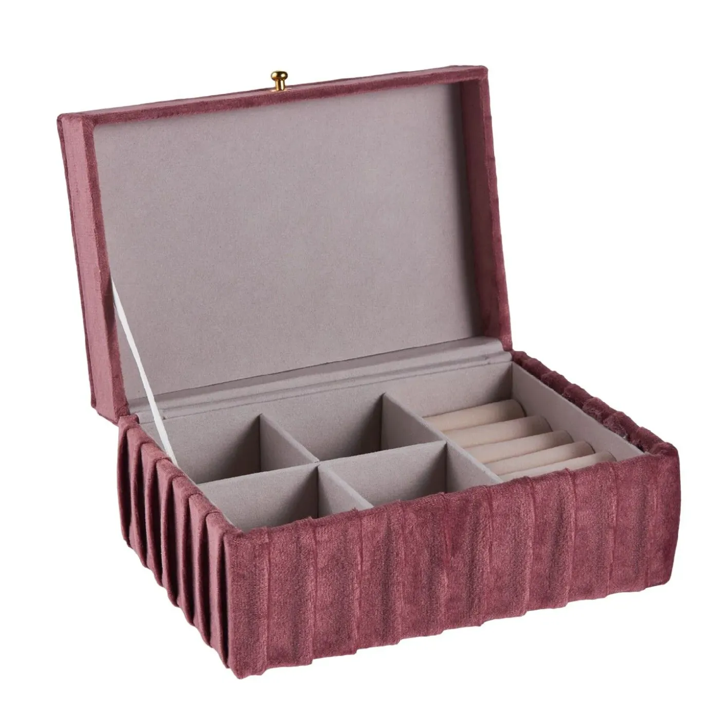 Aufteilung: 4 quadratische Fächer, 5 Schlitze für Ringe