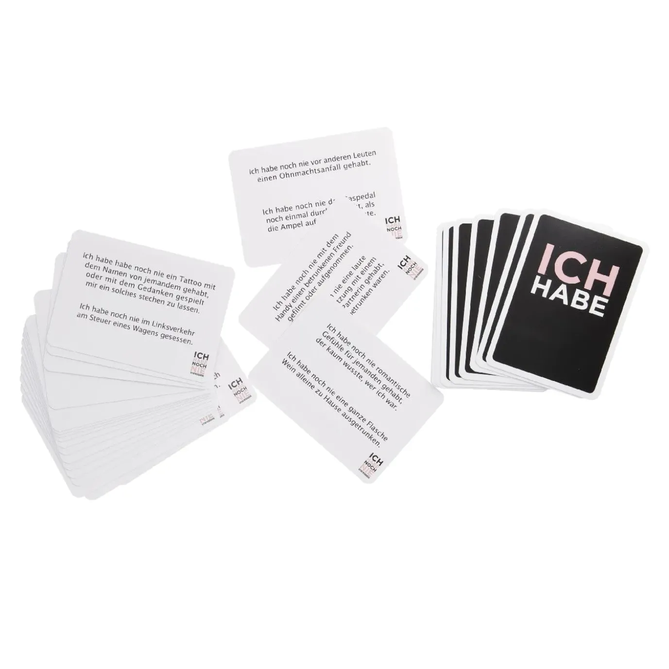 Die Spielregeln sind ganz einfach: Alles, was Du brauchst, sind ein paar Freund:innen sowie ausreichend Getränke, z.B.Wein oder Cocktails. (Natürlich tut’s auch Limonade). Die erste Spieler:in nimmt eine Karte auf und liest die Aussage laut vor. Zum Beispiel: ‚Ich habe noch nie eine Beziehung per SMS beendet‘. Nun muss jede aus der Runde, die schon einmal eine Beziehung per SMS beendet hat, entweder einen Schluck von ihrem Getränk nehmen oder ihre Karte mit ‚Ich habe‘ bzw. ‚Noch nie‘ hochhalten.