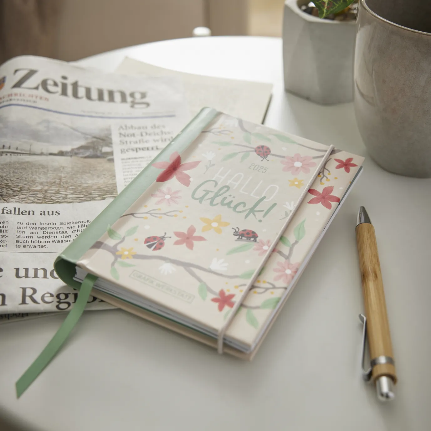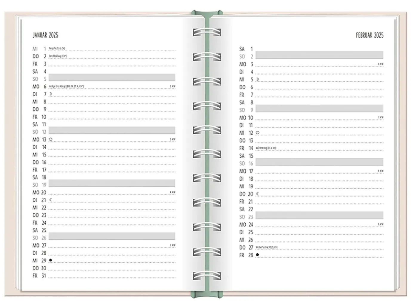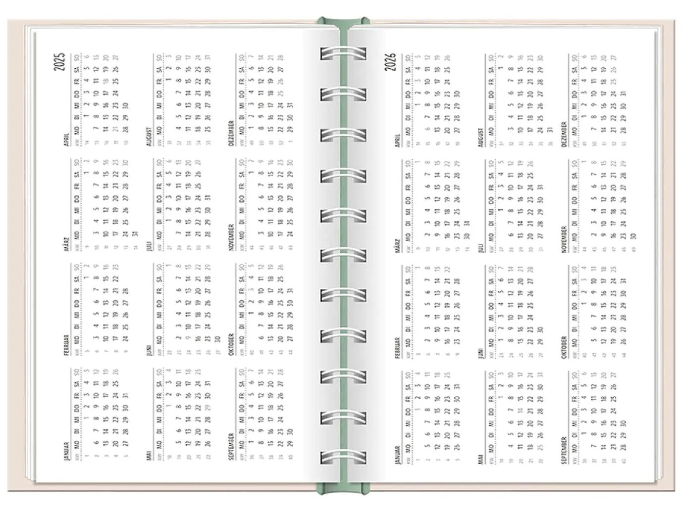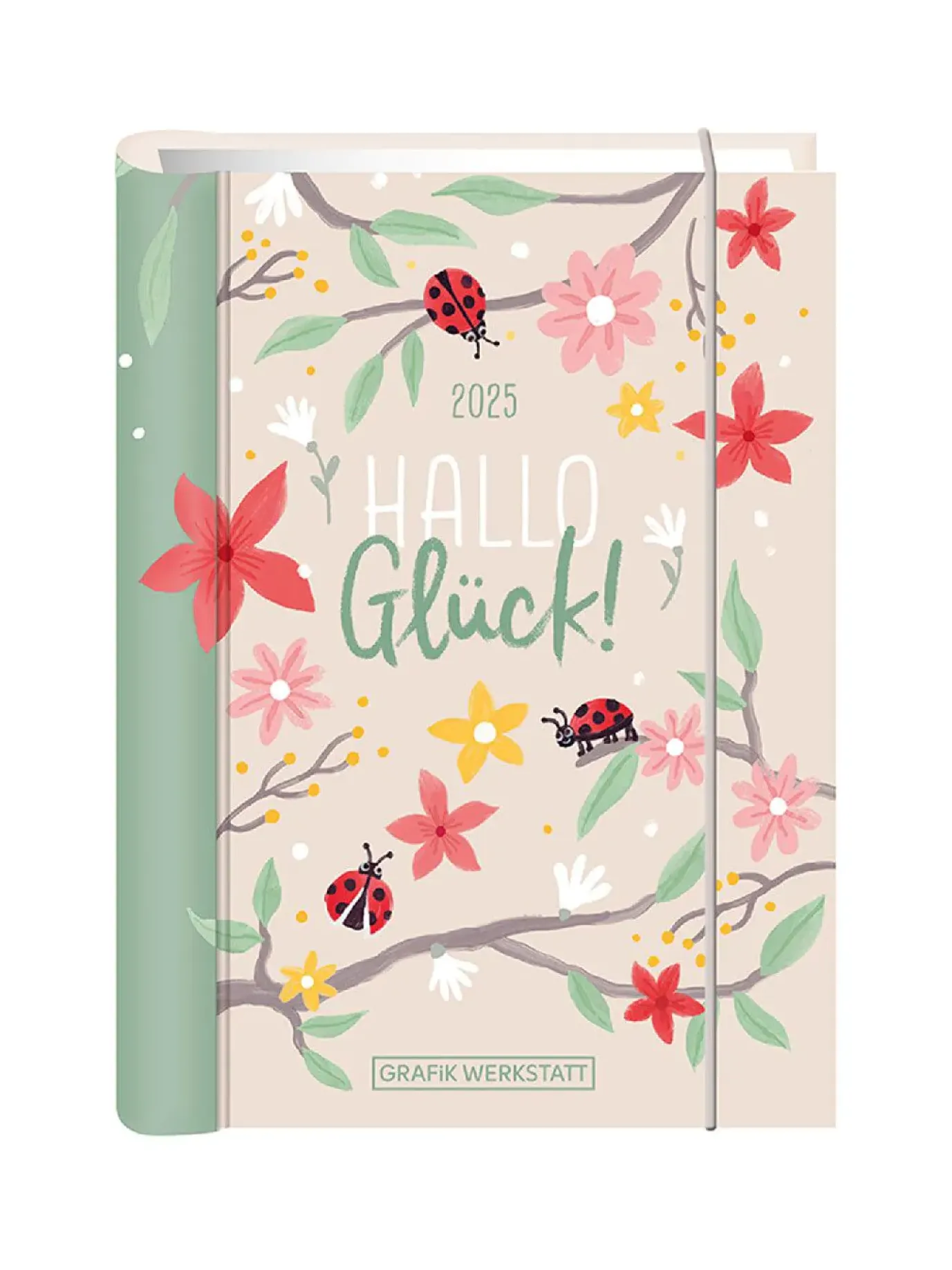 Stabiler Hardcover-Umschlag, Verschlussgummi, Lesezeichen-Bändchen aus Satin und 12 farbenfrohe Grafik Werkstatt-Motive. Jede Kalenderwoche wird übersichtlich auf einer Doppelseite dargestellt.