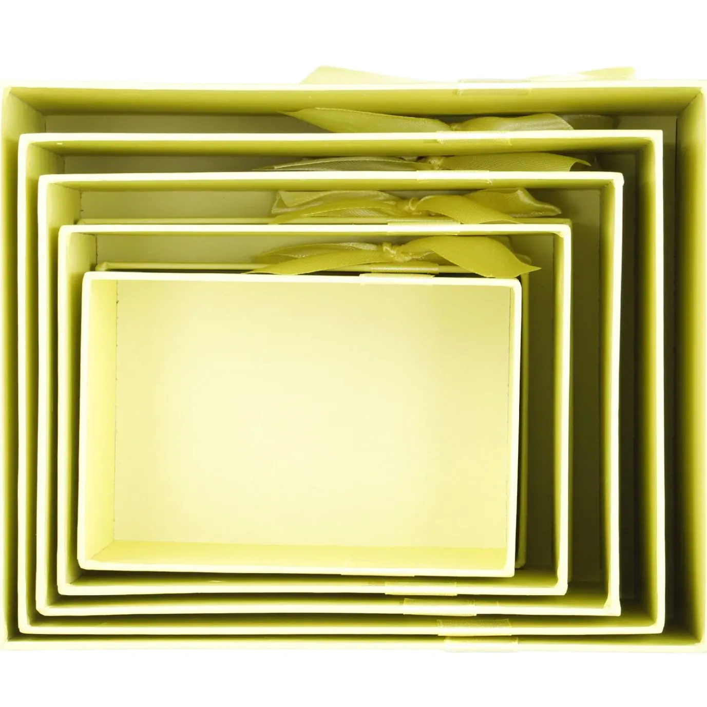Mit diesem Geschenkkarton-Set erhältst du fünf edle Boxen aus verstärktem Papier in verschiedenen Größen. Als optisches Highlight dient eine Zierschleife, welche jeder Karton trägt. Das Set ist in verschiedenen Farben erhältlich. Folgende Größen sind im Set enthalten: 13 x 9 x 8 cm15 x 11 x 9 cm17 x 13 x 9.5 cm18.5 x 14.5 x 10.5 cm20.5 x 16.5 x 11 cm