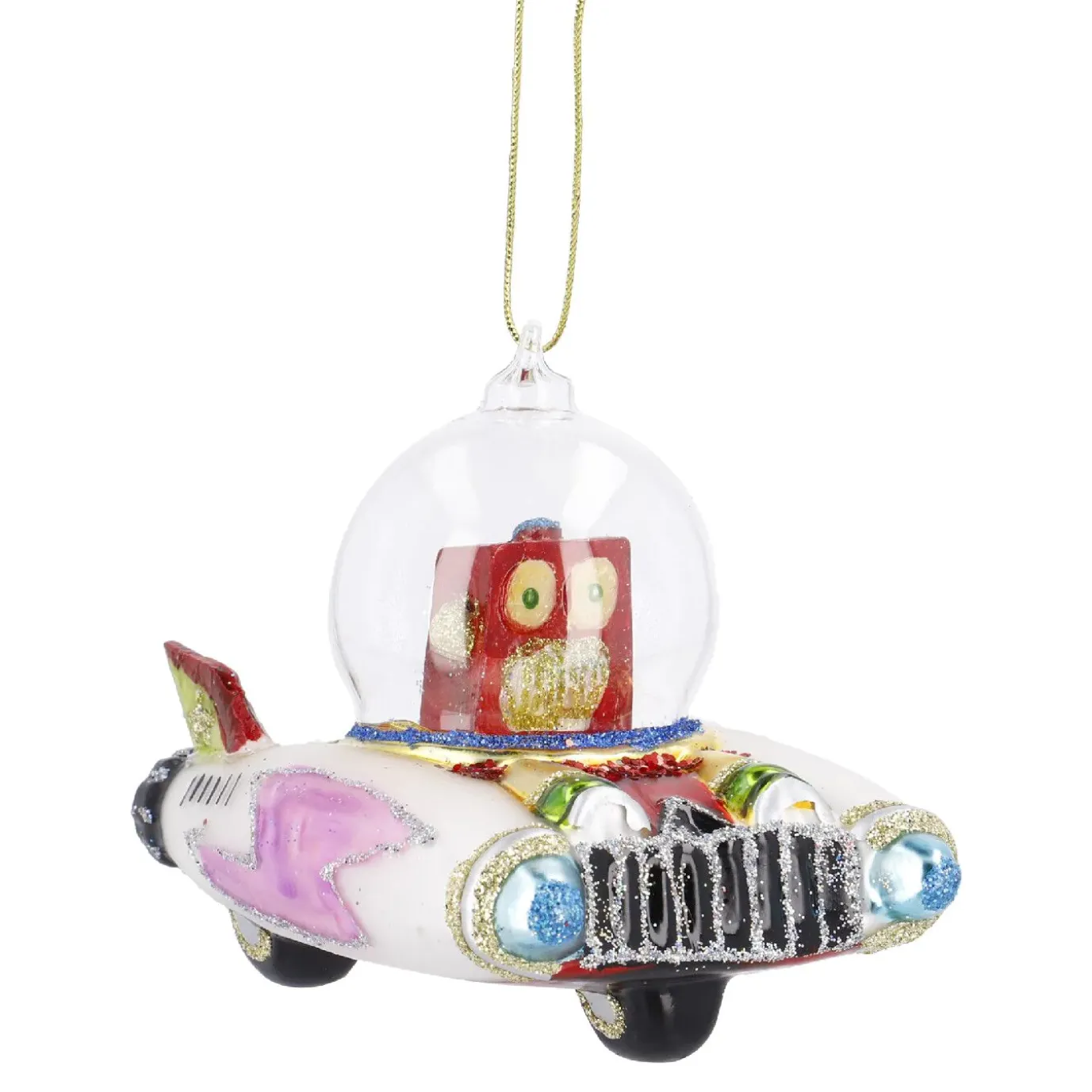 Nicht von dieser Welt, aber mit Cabrio – verrückter Weihnachtsbaumschmuck aus Glas in Form eines Roboters.