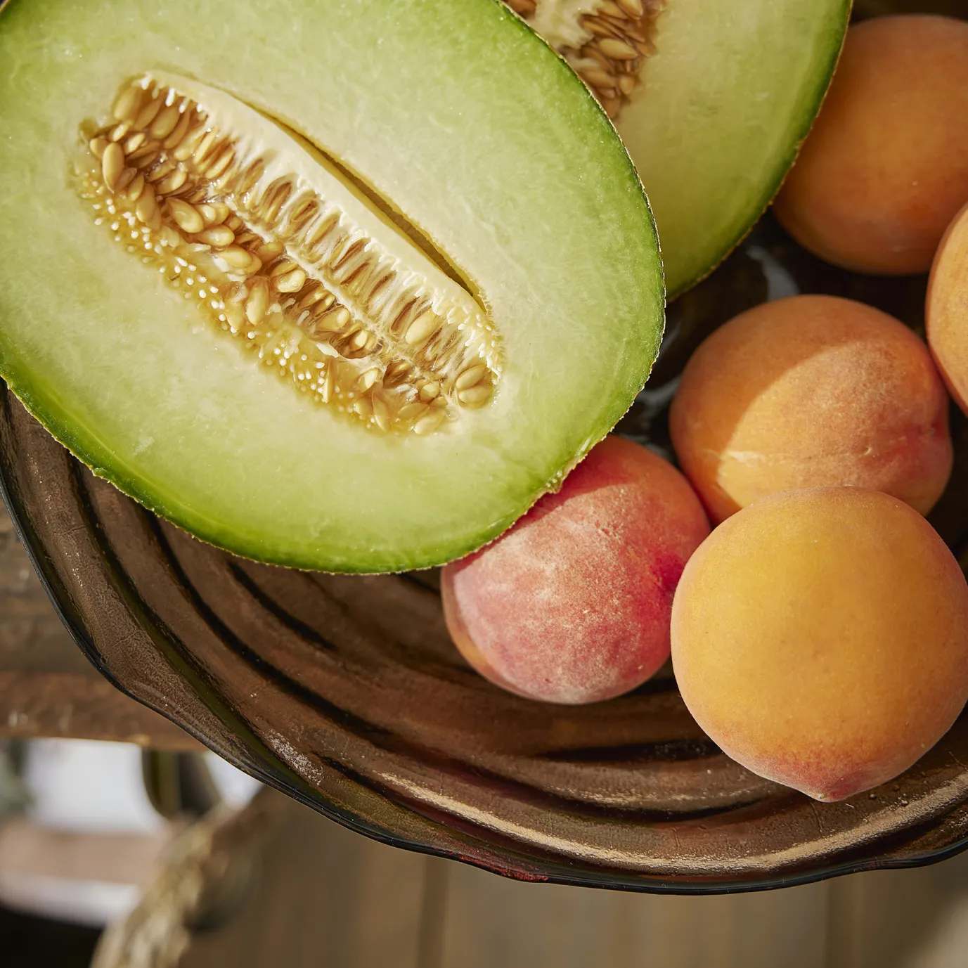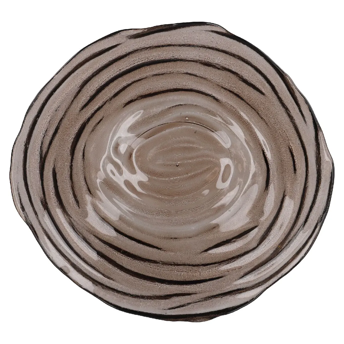 Diese taupe Glasschale erinnert an einen Wirbelsturm. Durch die organische Form ist die Schale nicht ganz rund. An der breitesten Stelle ist sie 32 cm breit. Insgesamt ist sie 11.5 cm hoch.
