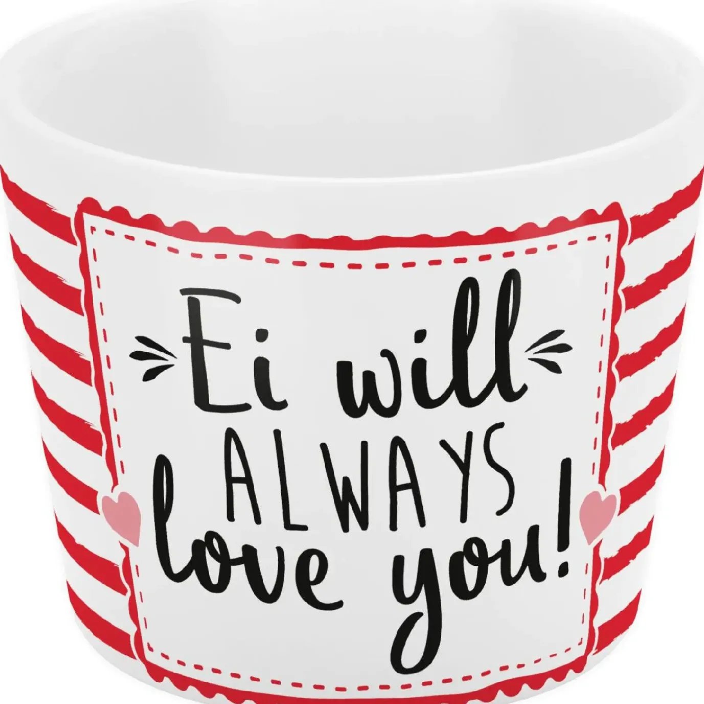 Dieser Eierbecher ist ein echter Hit! Er punktet nicht nur mit seinem bekannten Spruch »Ei will always love you!«, sondern auch mit seinem fröhlichen Design. Perfekt für Verliebte, die das etwas andere Geschenk zu Ostern oder Geburtstag bevorzugen.