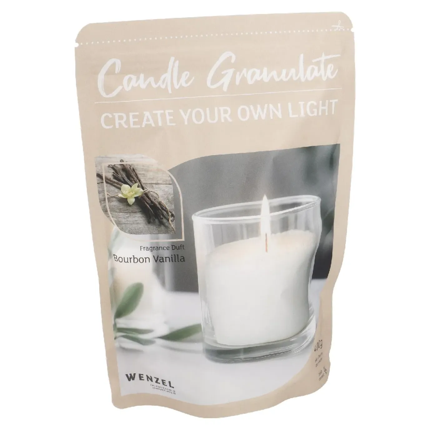 Eingefüllt in einem hitzebeständigem Gefäß, wie z.B. Glas, verwandelt das Wachsgranulat dieses in eine einzigartige Kerze. Vier passende Dochte liegen jeder Packung bei und lassen sich mühelos auf die benötigte Länge zuschneiden.