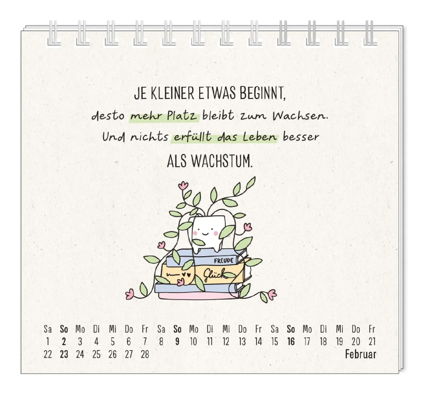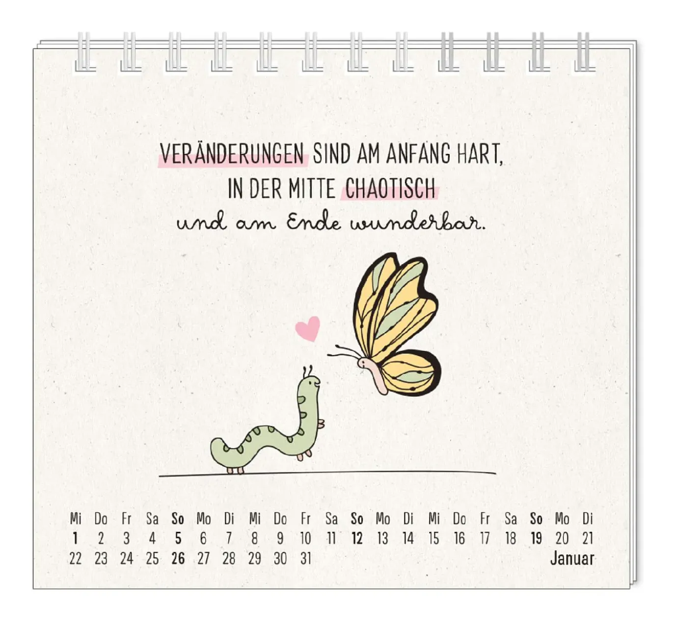Dieser kleine Tischkalender versprüht Monat für Monat ganz viel Lebens- und Farbenfreude. Ob Vintage oder Wortschätzchen ? Jeder von unseren Mini-Kalender schenkt eine Extraportion Gute Laune. Inklusive einer Jahresübersicht und der wichtigsten Feier- und Festtage.