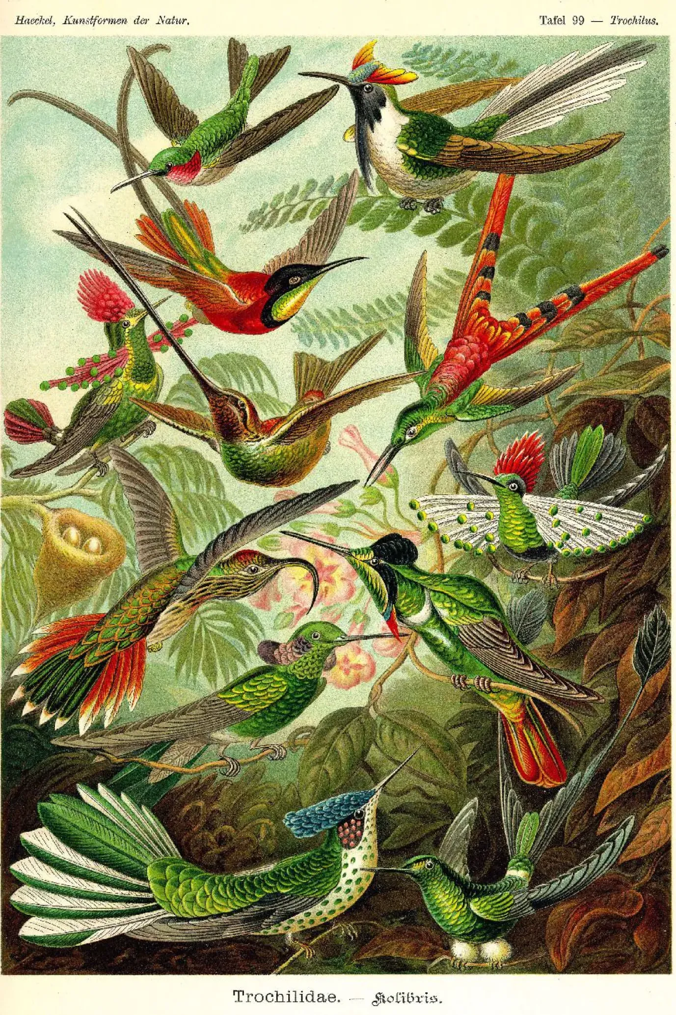 Die wunderschönen Kolibris von Ernst Haeckel erschienen 1899 erstmals im Buch Kunstformen der Natur. Ein tolles Geschenk für Vogelliebhaber und Naturfreunde.