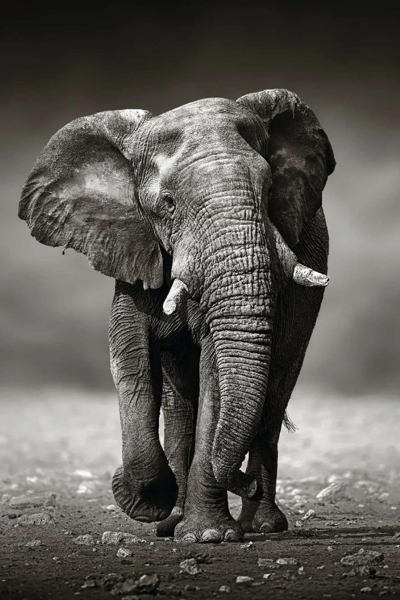 Ausdruckstarkes schwarz-weiß Wandbild eines Elefanten.