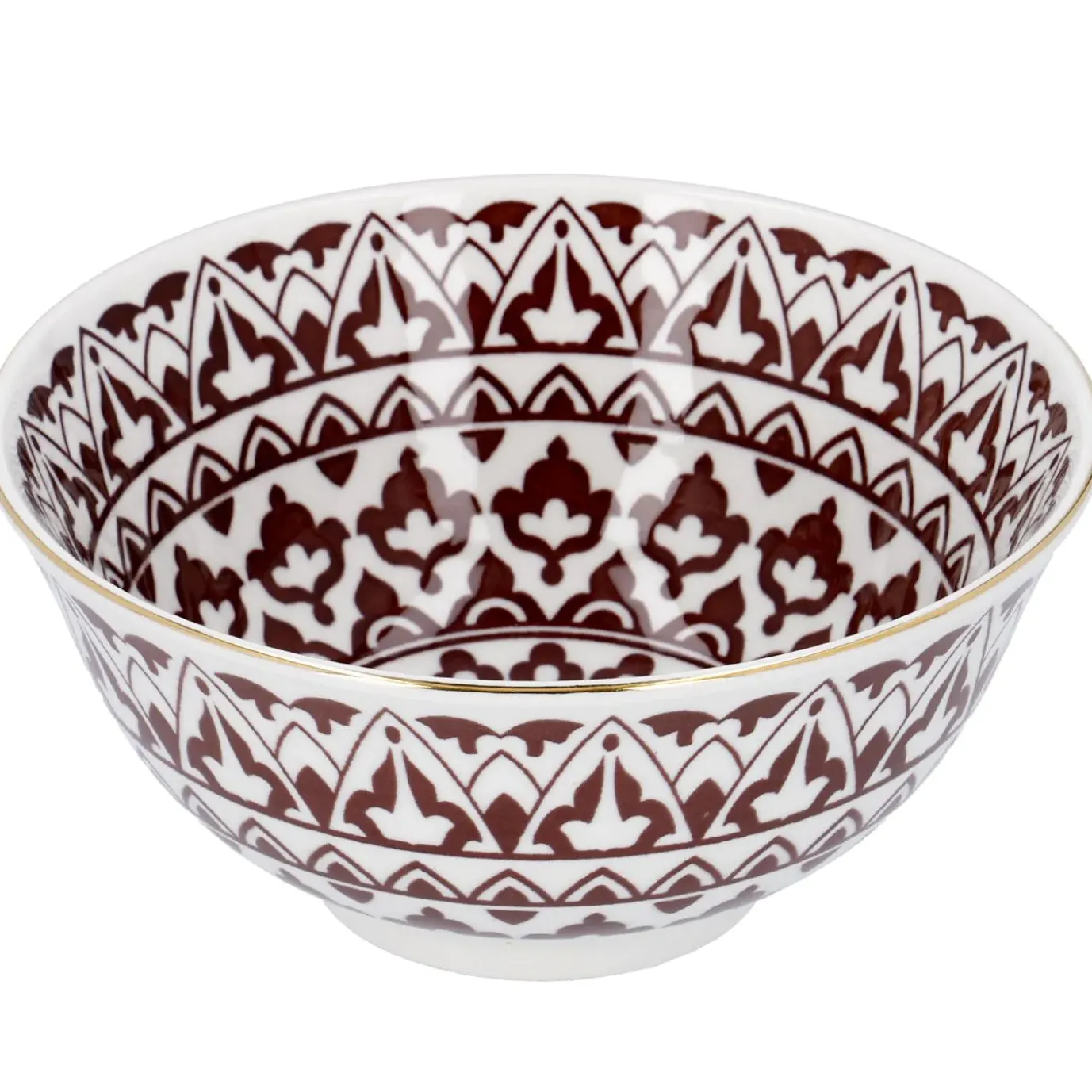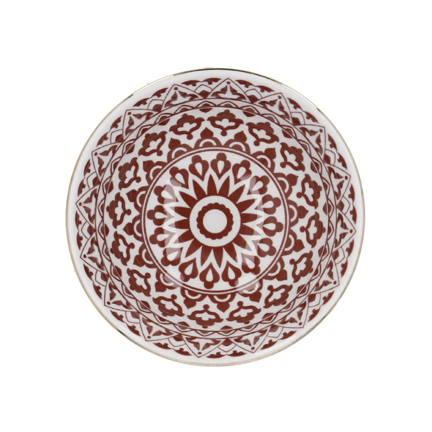 Mit dieser bordeaux-weißen Schale aus feinstem Porzellan kannst du Suppen, Bowls oder Müsli stilvoll genießen. Auch deine Gäste werden begeistert sein, wenn du leckere Kleinigkeiten und Snacks in dieser Schale servierst. Durchmesser: 15 cm.Die Größe und das Gewicht beziehen sich auf eine Schale.