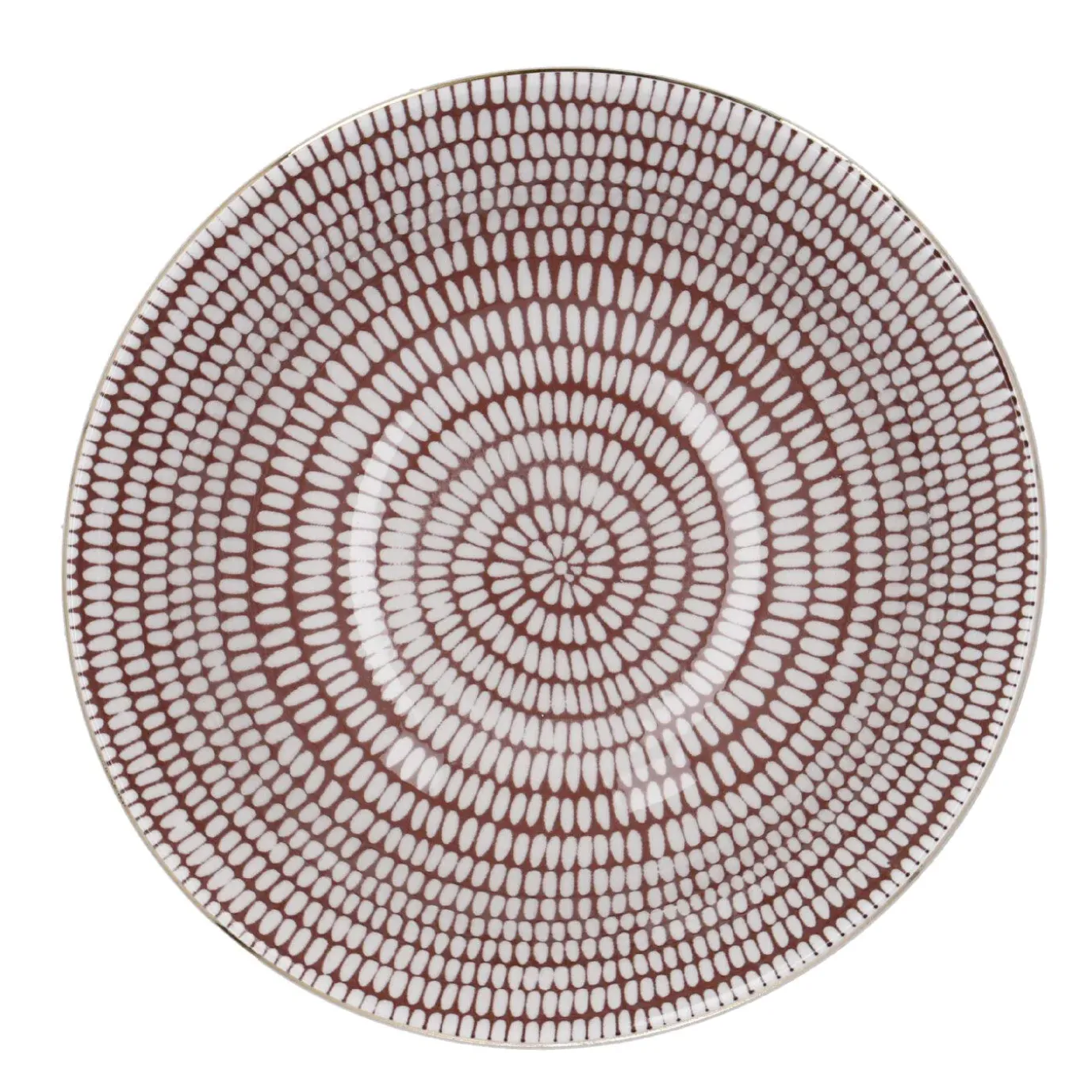 Serviere deinen Gästen Tapas, Snacks und andere kleine Leckereien in dieser bordeaux-weißen Schale aus Porzellan mit Muster und Goldrand. Durchmesser: 12 cm.Die Größe und das Gewicht beziehen sich auf eine Schale.