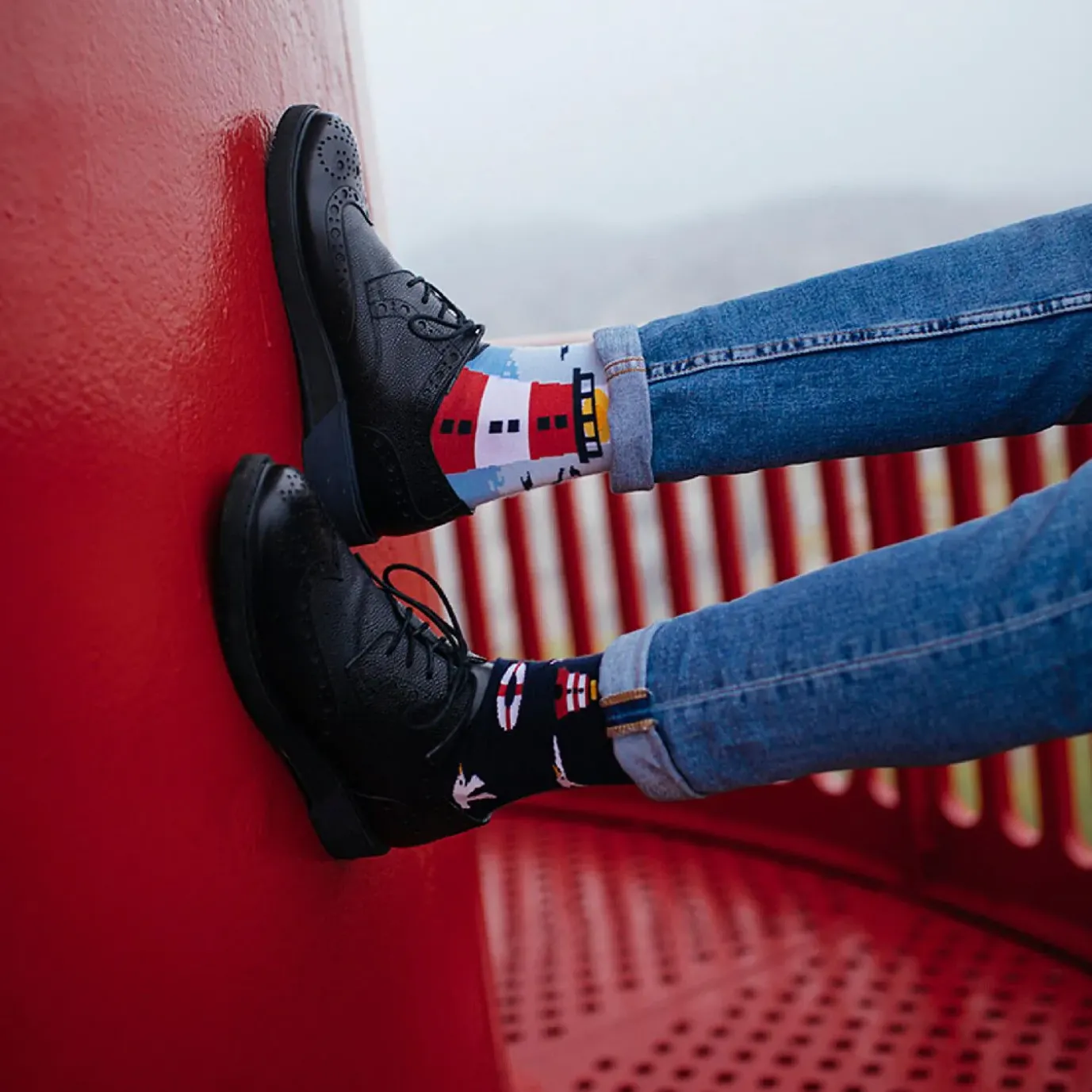 Wellen brechen, Möwen kreischen, die Meeresbrise weht herein und in der Ferne steht ein Leuchtturm. Es ist etwas Unbeschreibliches, am Meer zu sein – fühle die Brise mit diesen Leuchtturmsocken!
